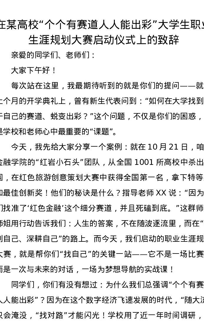 在某高校“个个有赛道人人能出彩”大学生职业生涯规划大赛启动仪式上的致辞