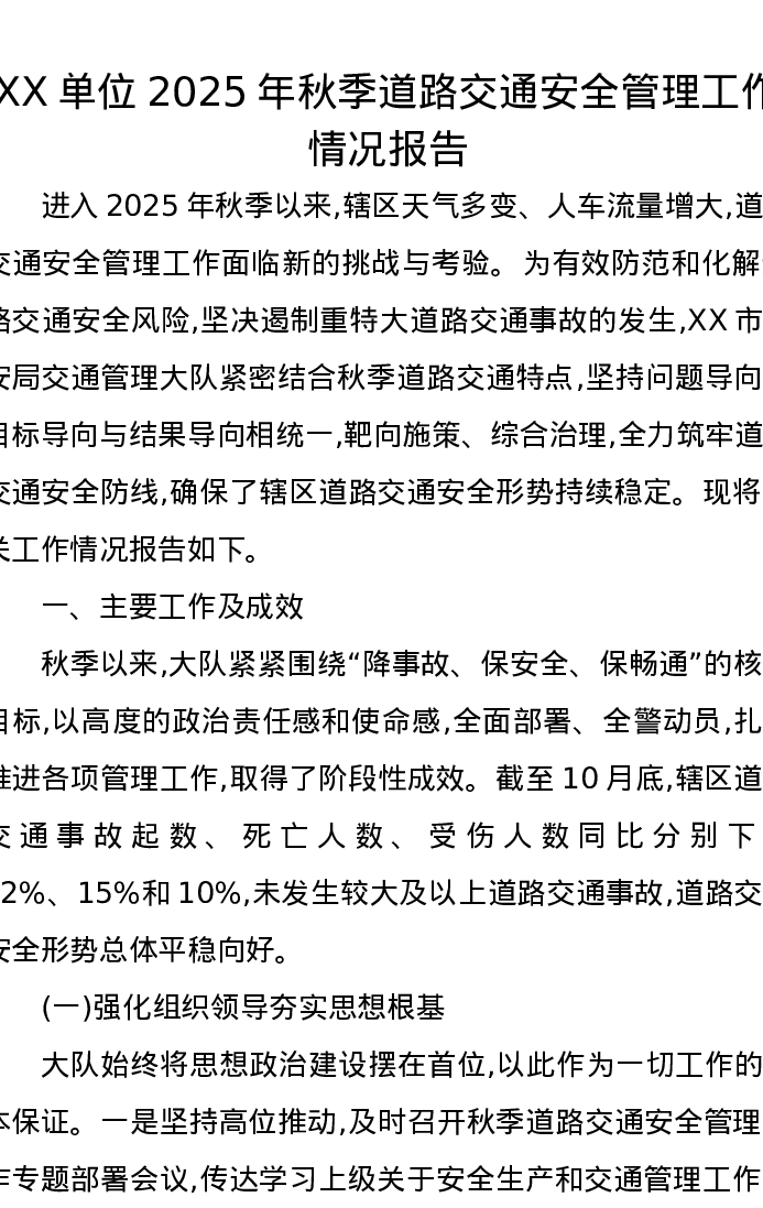 XX单位2025年秋季道路交通安全管理工作情况报告