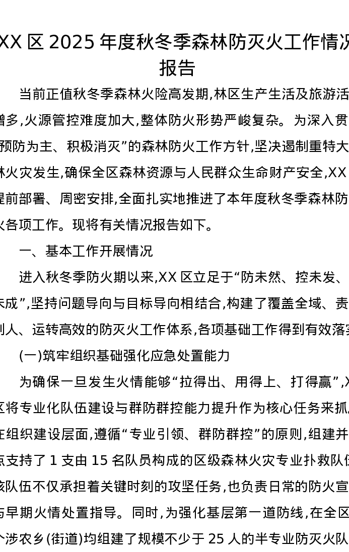 XX区2025年度秋冬季森林防灭火工作情况报告