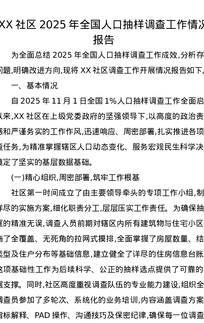 XX社区2025年全国人口抽样调查工作情况报告