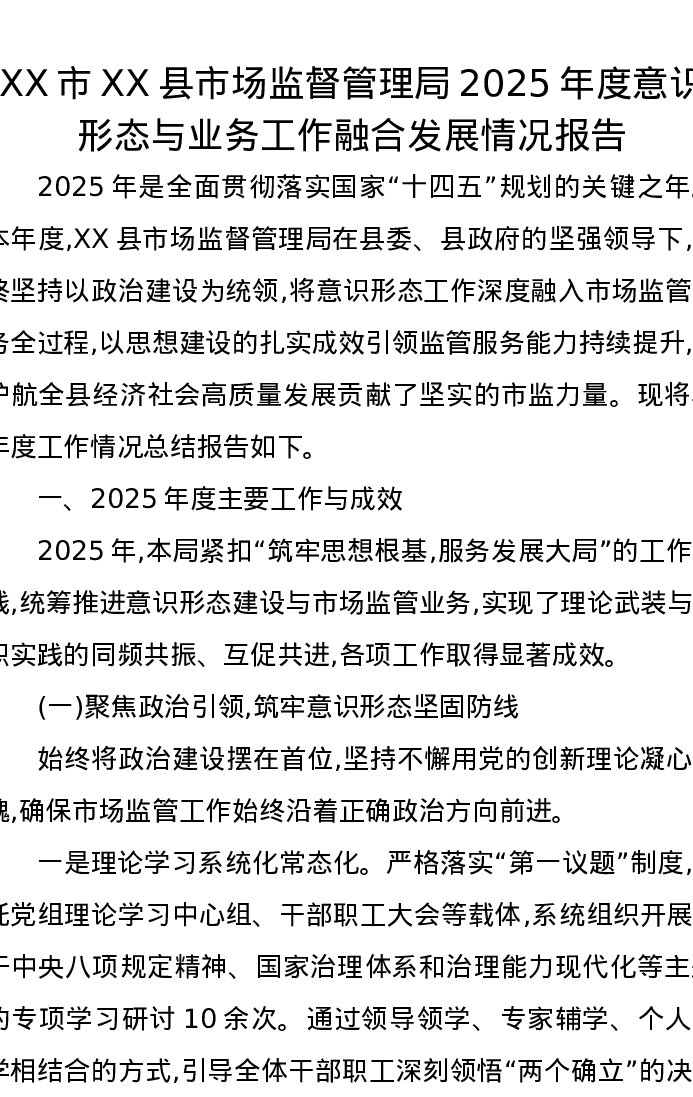XX市XX县市场监督管理局2025年度意识形态与业务工作融合发展情况报告