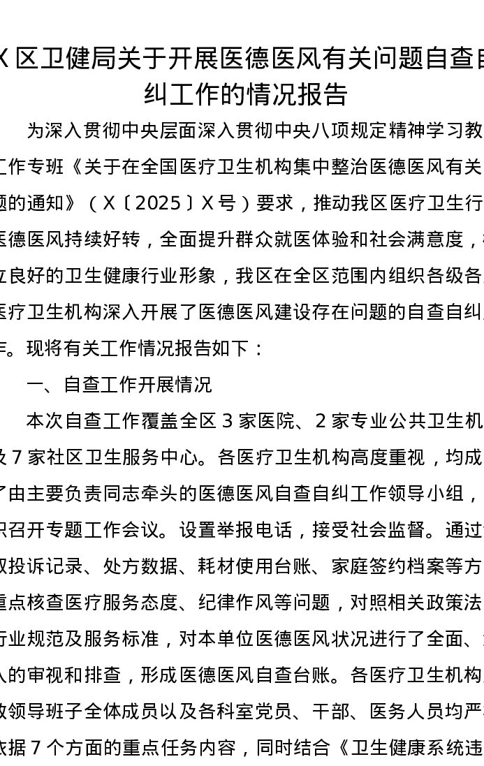 X区卫健局关于开展医德医风有关问题自查自纠工作的情况报告