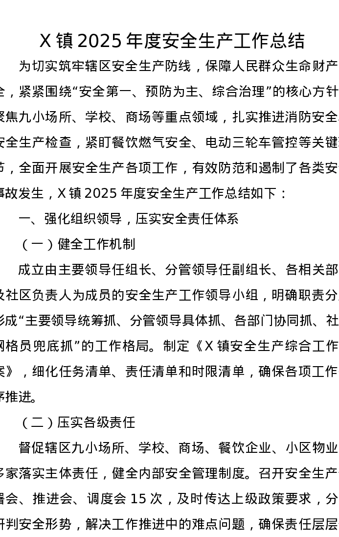 X镇2025年度安全生产工作总结