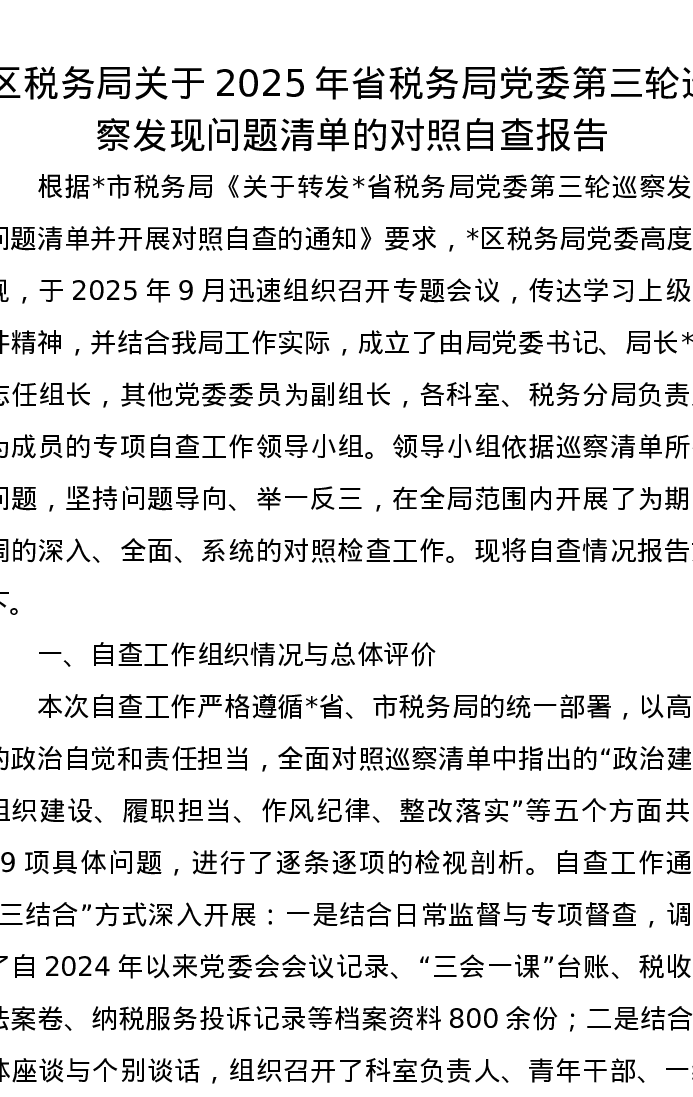 区税务局关于2025年省税务局党委第三轮巡察发现问题清单的对照自查报告