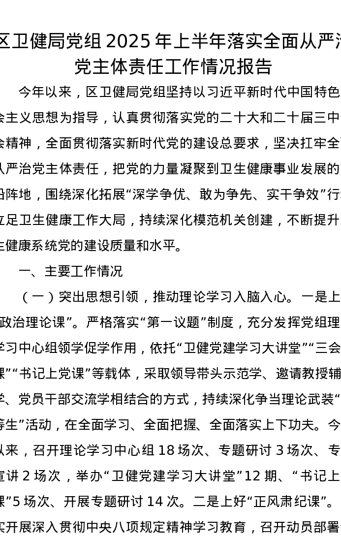 区卫健局党组2025年上半年落实全面从严治党主体责任工作情况报告