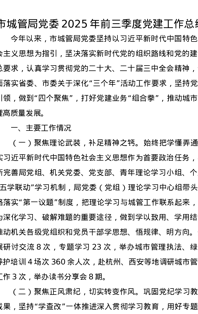 市城管局党委2025年前三季度党建工作总结