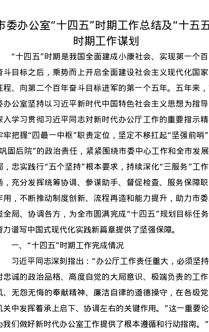 市委办公室“十四五”时期工作总结及“十五五”时期工作谋划
