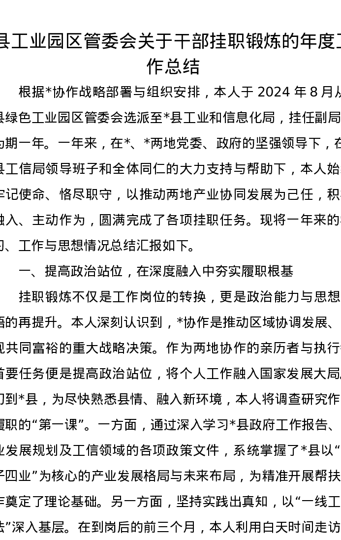 县工业园区管委会关于干部挂职锻炼的年度工作总结