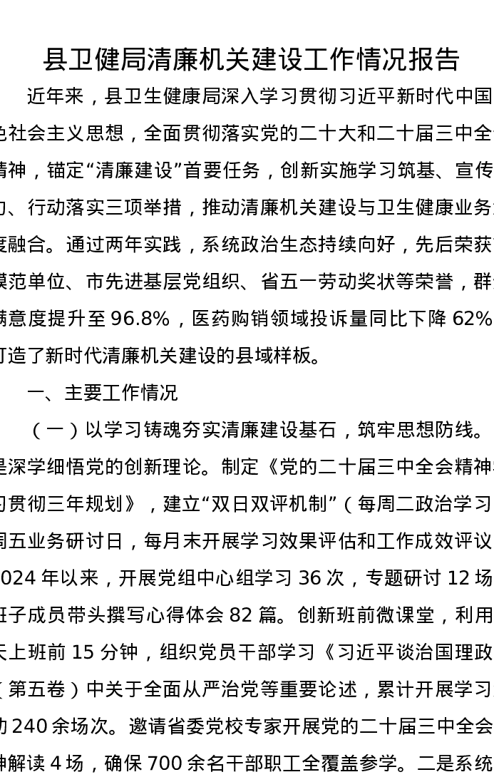 县卫健局清廉机关建设工作情况报告