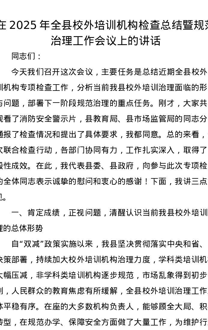 在2025年全县校外培训机构检查总结暨规范治理工作会议上的讲话
