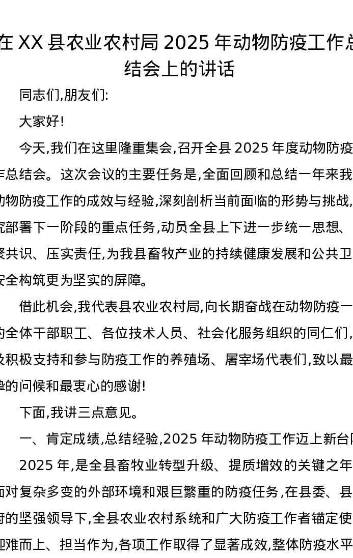 在XX县农业农村局2025年动物防疫工作总结会上的讲话