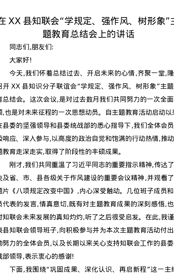 在XX县知联会“学规定、强作风、树形象”主题教育总结会上的讲话