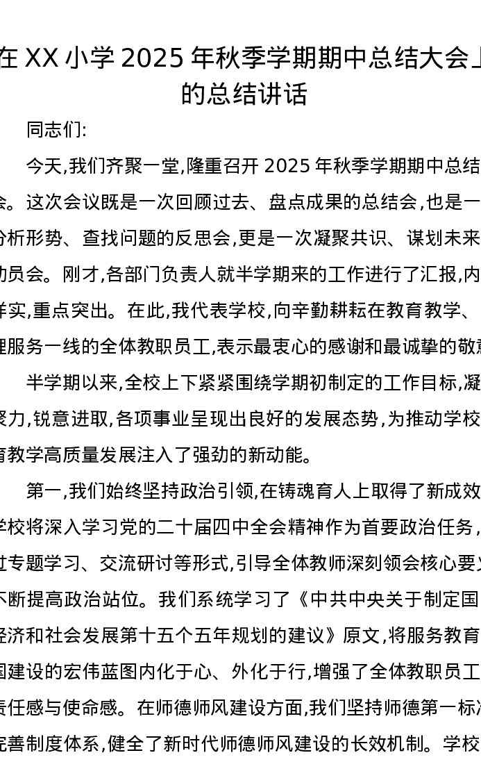 在XX小学2025年秋季学期期中总结大会上的总结讲话