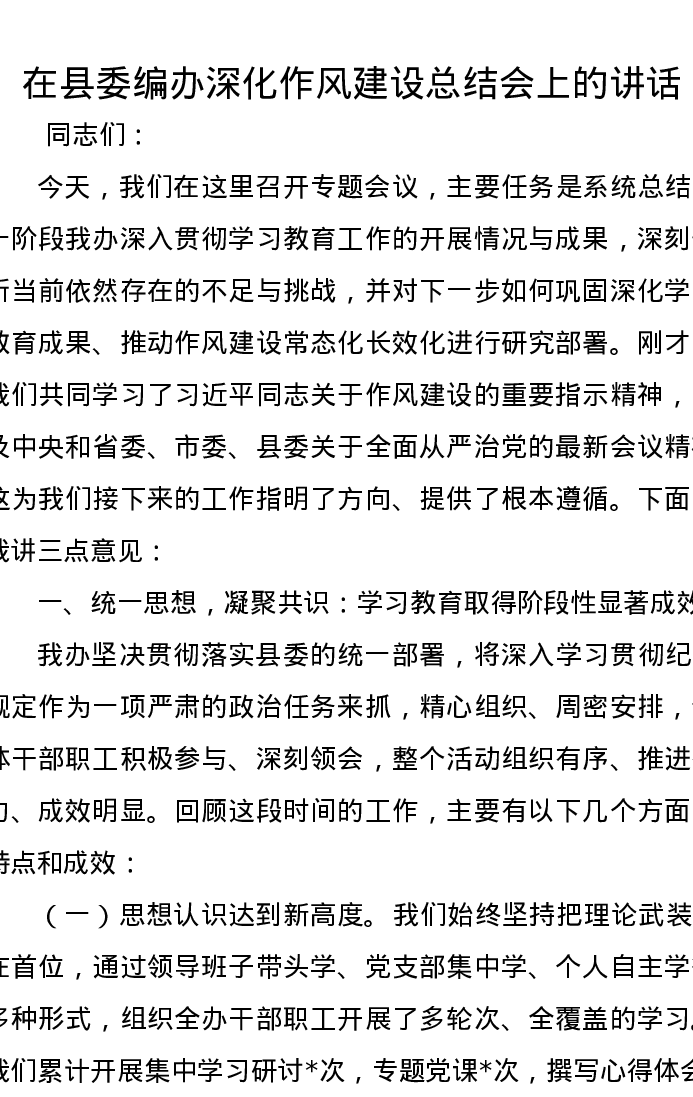 在县委编办深化作风建设总结会上的讲话
