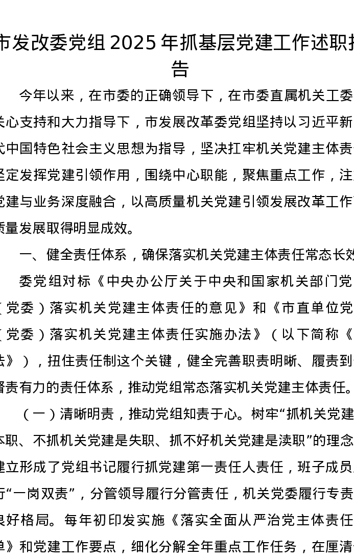 市发改委党组2025年抓基层党建工作述职报告