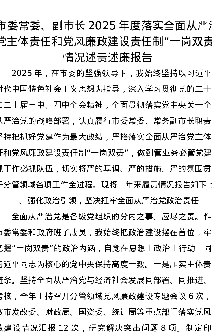 市委常委、副市长2025年度落实全面从严治党主体责任和党风廉政建设责任制“一岗双责”情况述责述廉报告