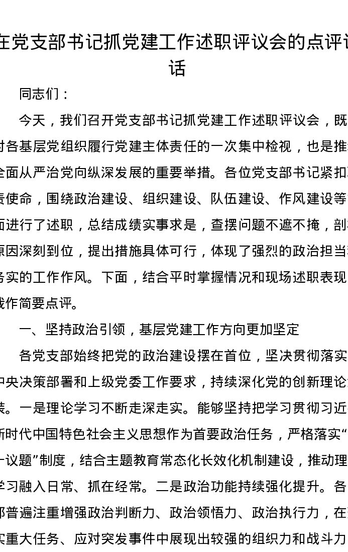 在党支部书记抓党建工作述职评议会的点评讲话