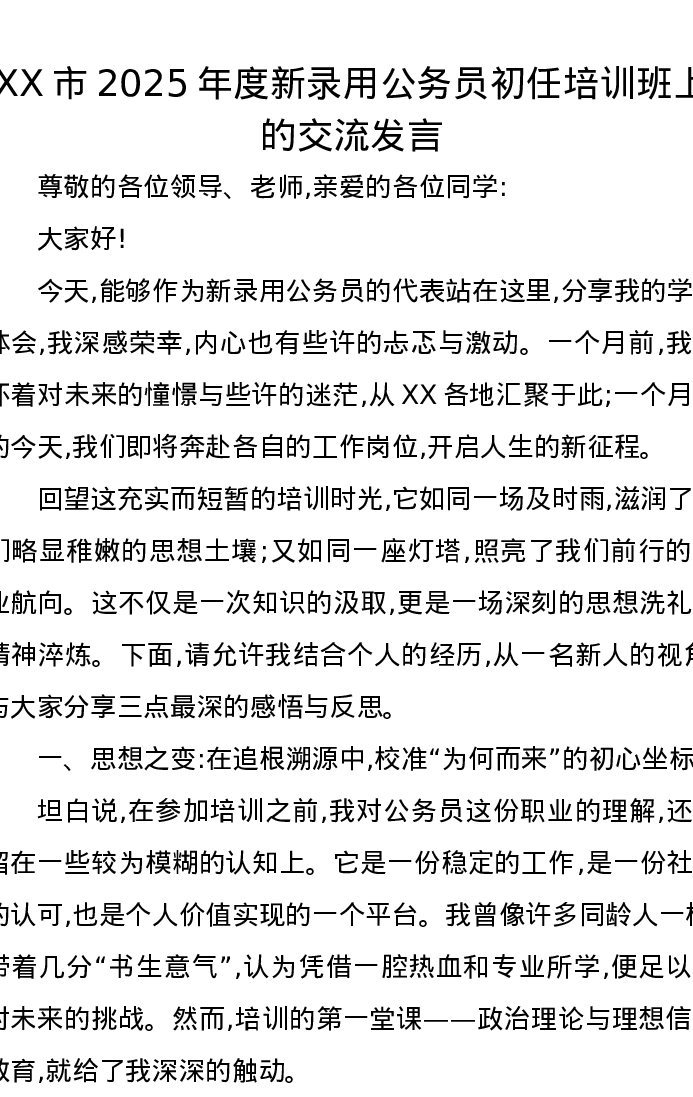 XX市2025年度新录用公务员初任培训班上的交流发言