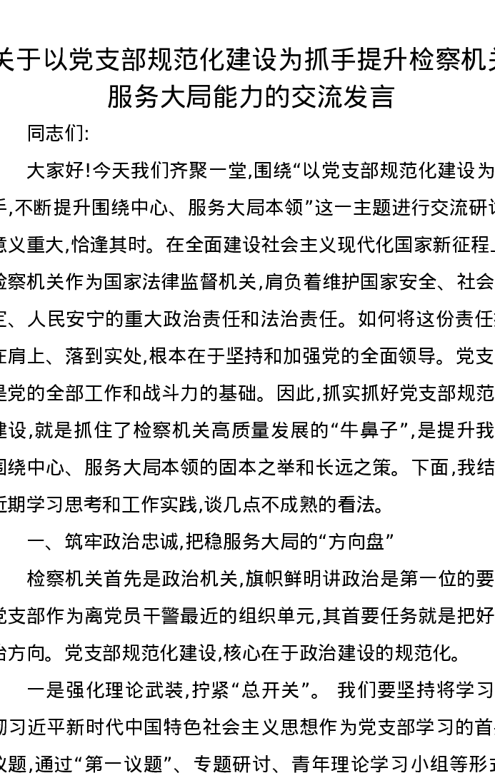 关于以党支部规范化建设为抓手提升检察机关服务大局能力的交流发言