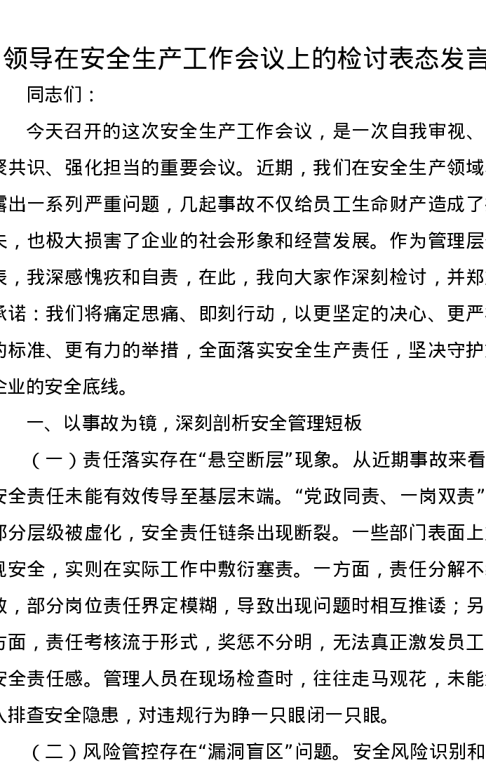 领导在安全生产工作会议上的检讨表态发言