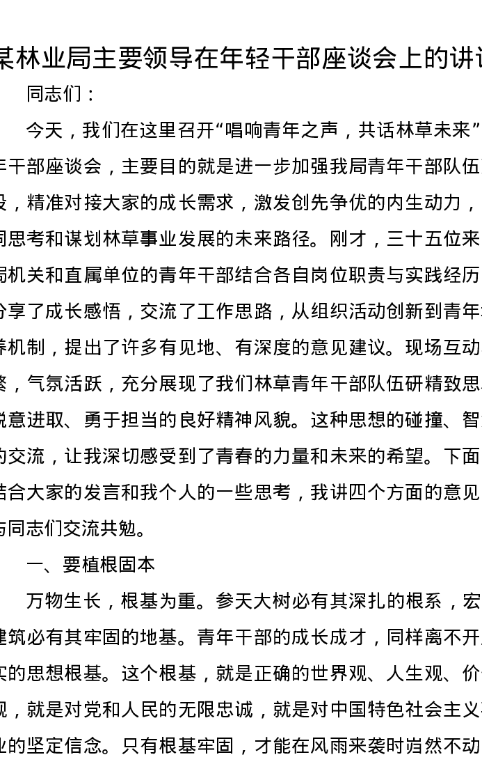 某林业局主要领导在年轻干部座谈会上的讲话