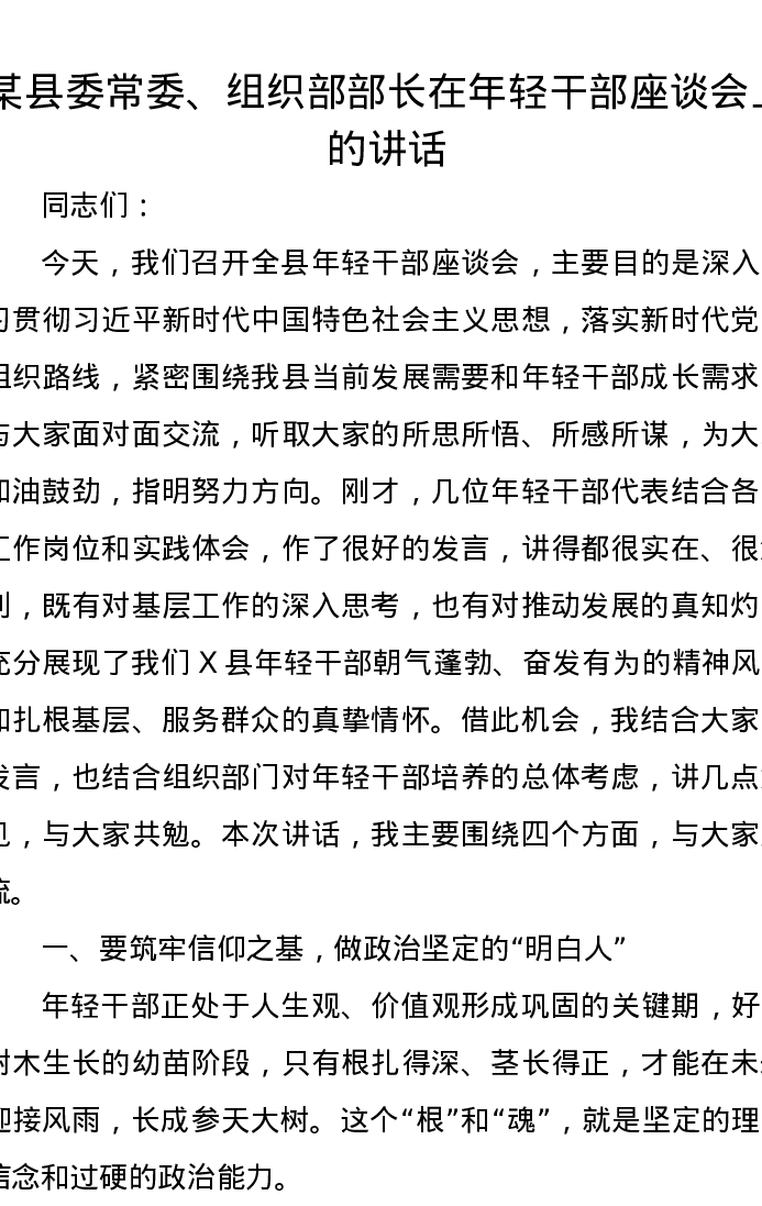 某县委常委、组织部部长在年轻干部座谈会上的讲话