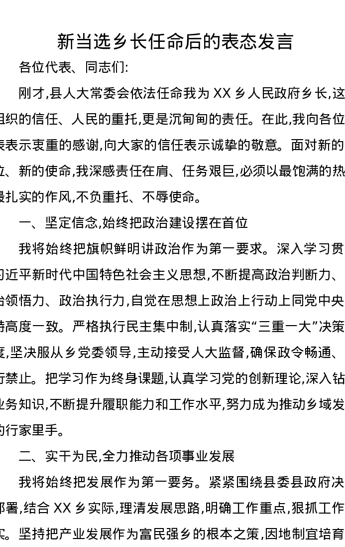 新当选乡长任命后的表态发言