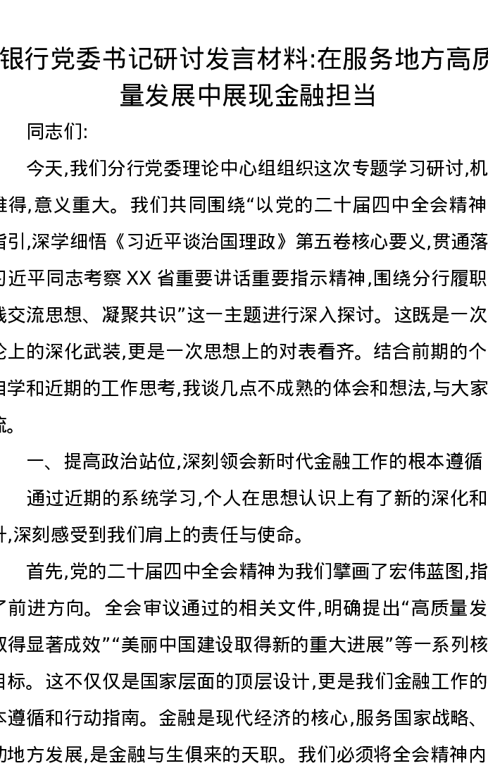 银行党委书记研讨发言材料:在服务地方高质量发展中展现金融担当