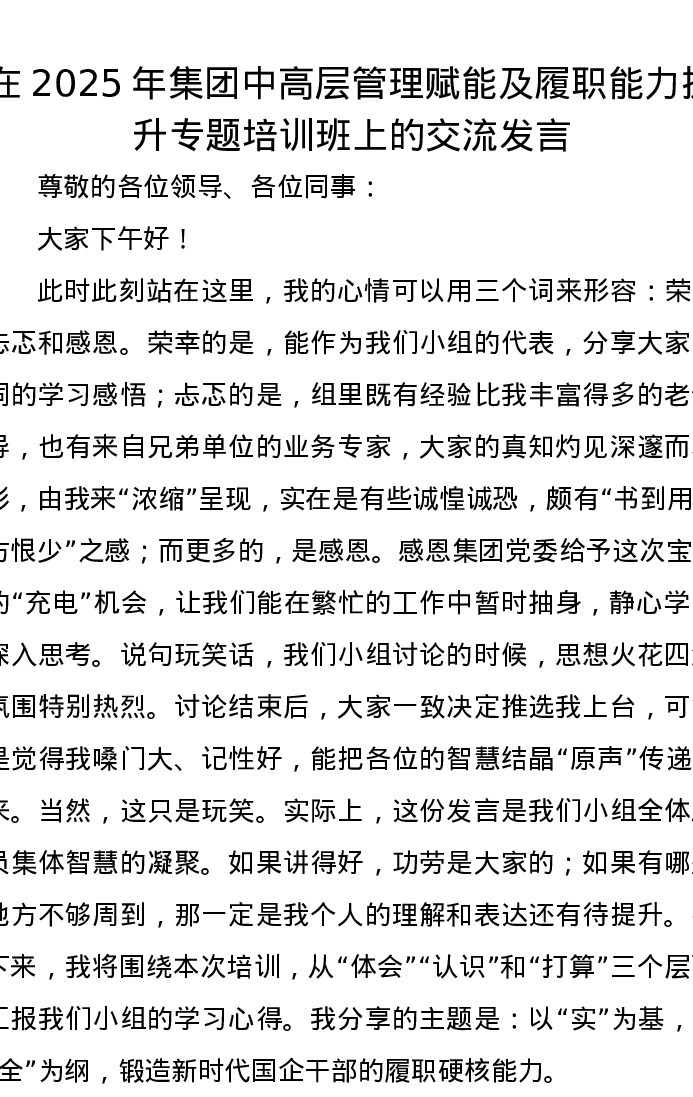 在2025年集团中高层管理赋能及履职能力提升专题培训班上的交流发言