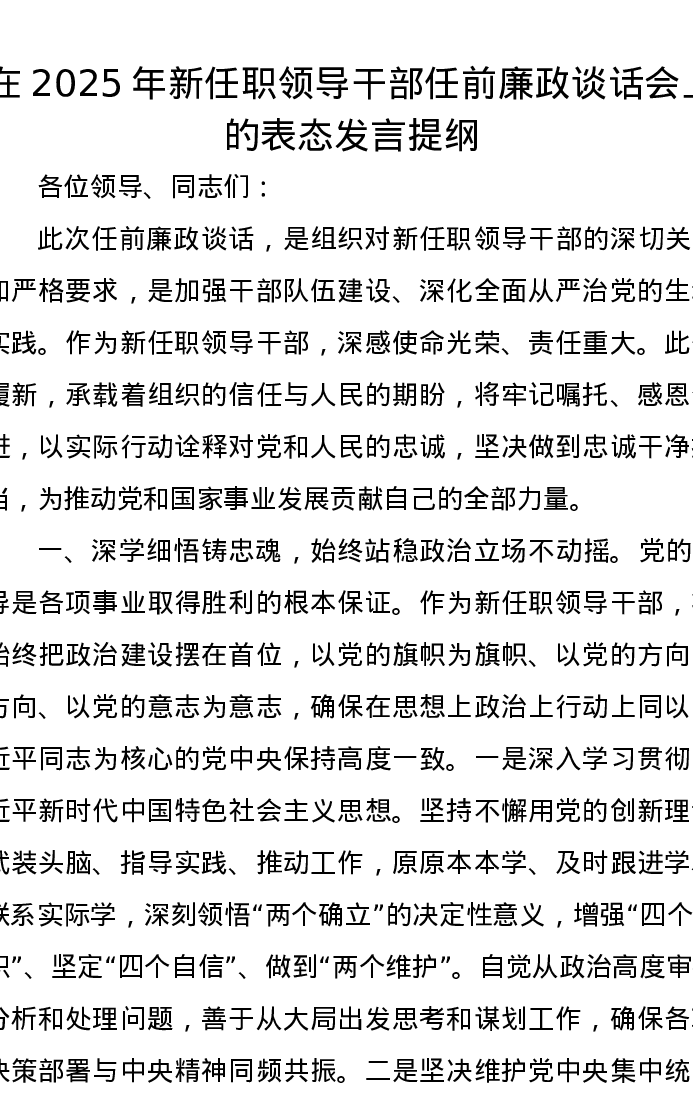 在2025年新任职领导干部任前廉政谈话会上的表态发言提纲