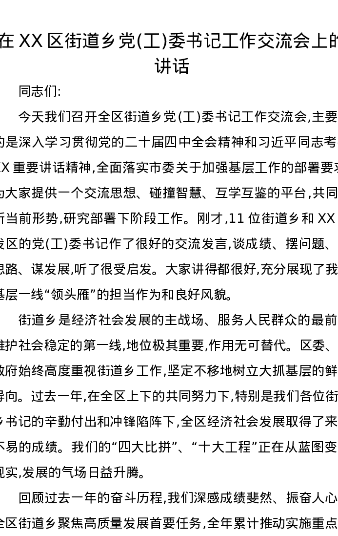 在XX区街道乡党(工)委书记工作交流会上的讲话