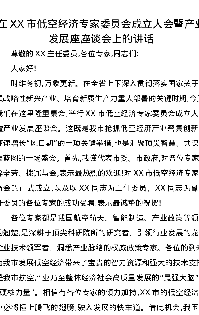 在XX市低空经济专家委员会成立大会暨产业发展座座谈会上的讲话