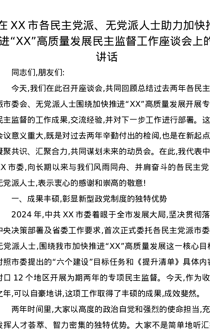 在XX市各民主党派、无党派人士助力加快推进“XX”高质量发展民主监督工作座谈会上的讲话