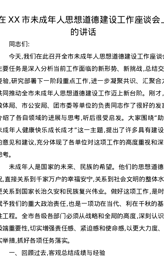 在XX市未成年人思想道德建设工作座谈会上的讲话