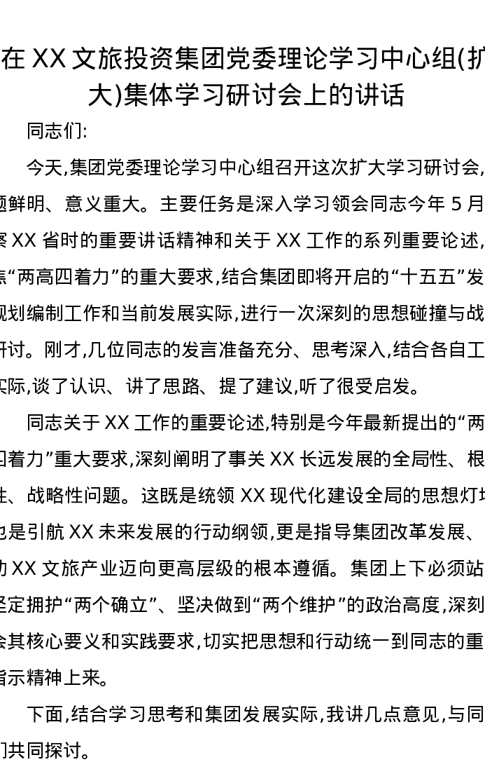 在XX文旅投资集团党委理论学习中心组(扩大)集体学习研讨会上的讲话