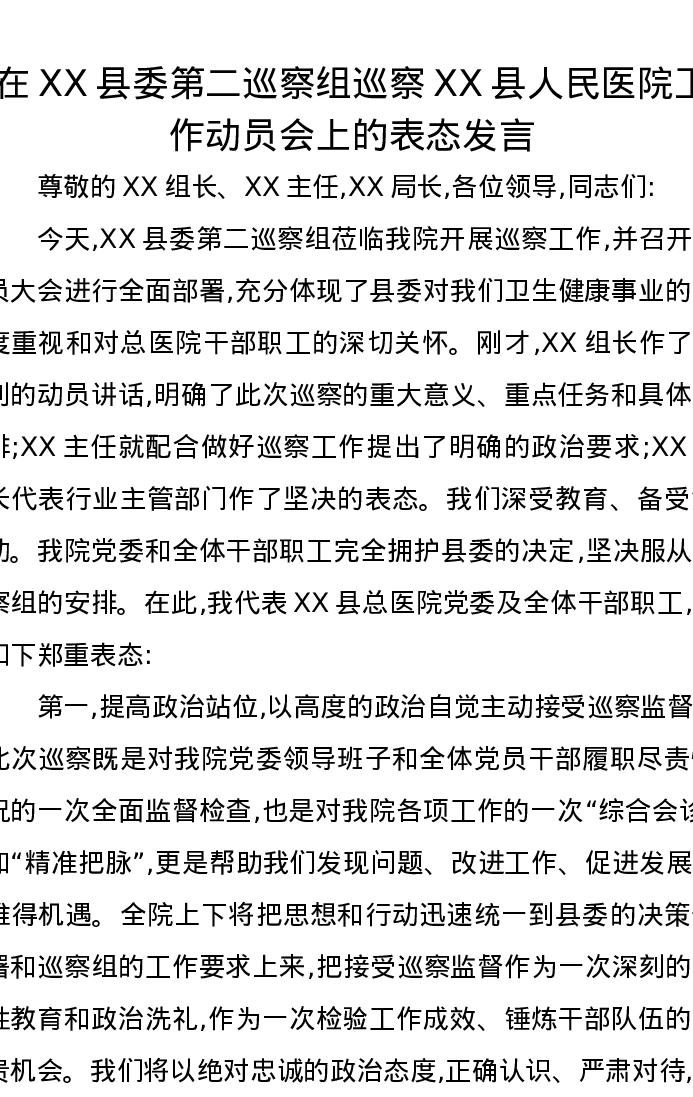 在XX县委第二巡察组巡察XX县人民医院工作动员会上的表态发言