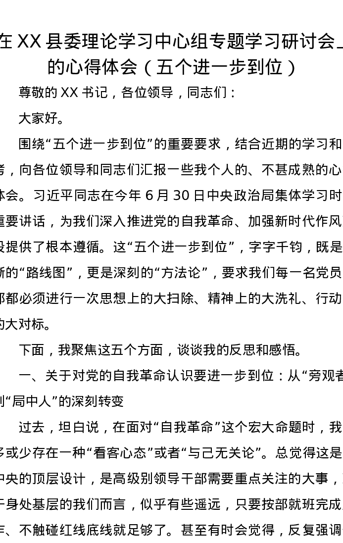 在XX县委理论学习中心组专题学习研讨会上的心得体会(五个进一步到位)