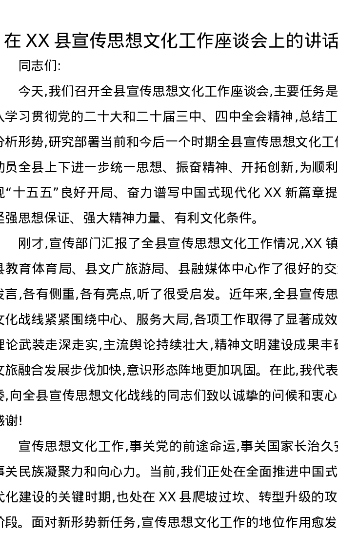 在XX县宣传思想文化工作座谈会上的讲话