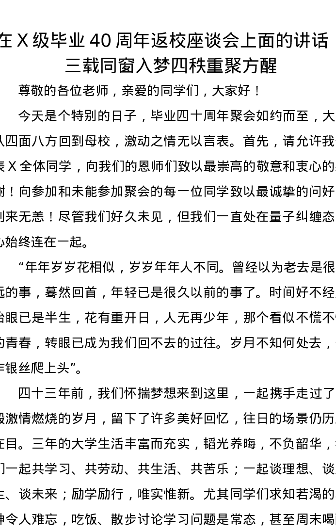 在X级毕业40周年返校座谈会上面的讲话:三载同窗入梦四秩重聚方醒