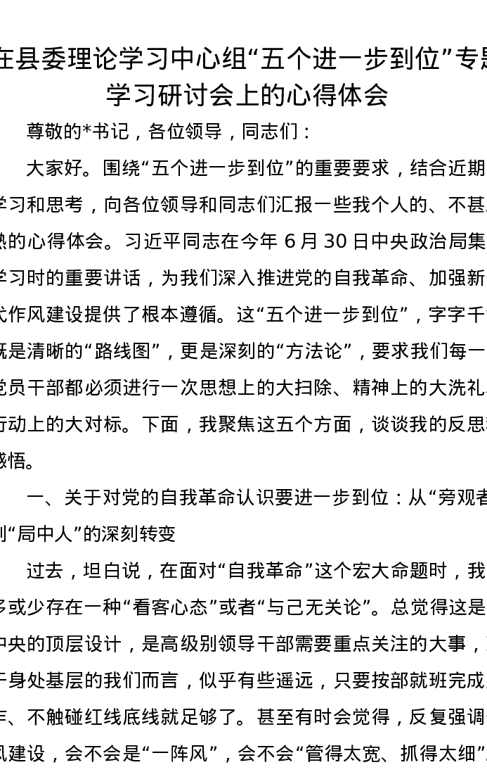 在县委理论学习中心组“五个进一步到位”专题学习研讨会上的心得体会