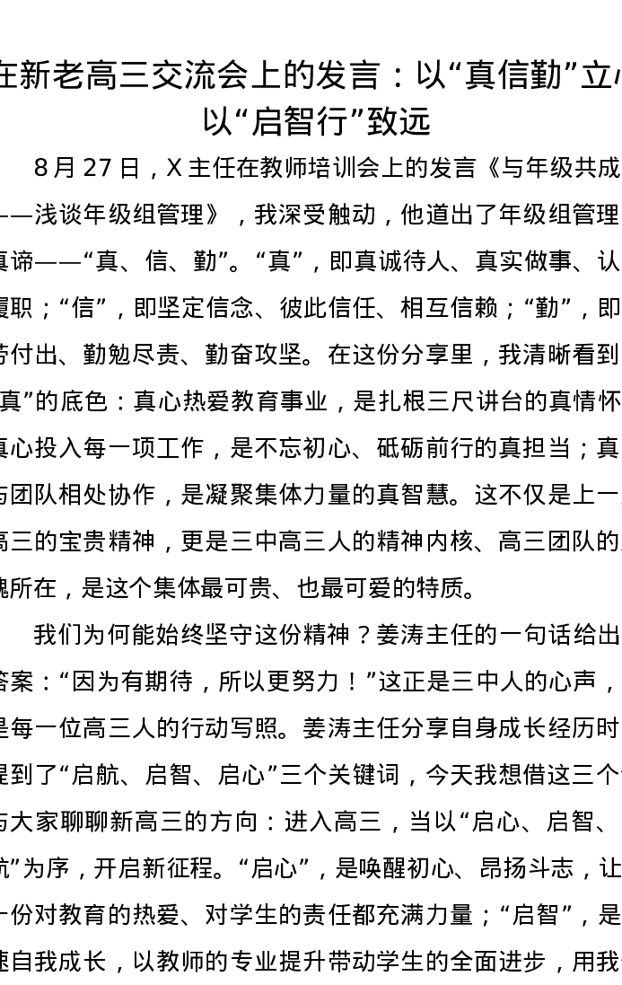 在新老高三交流会上的发言:以“真信勤”立心,以“启智行”致远