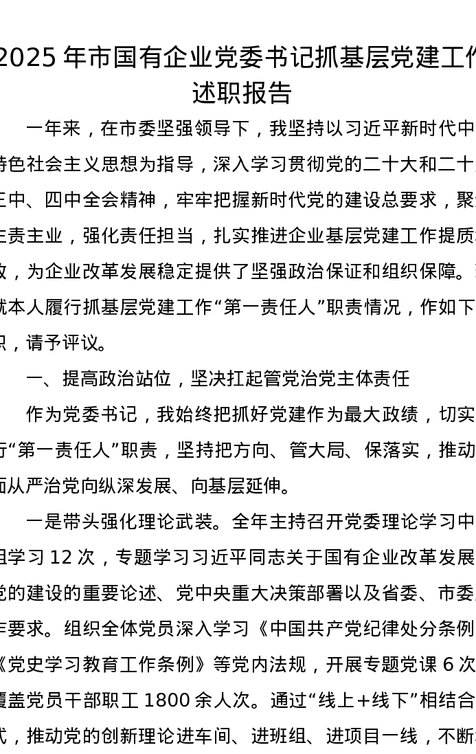 2025年市国有企业党委书记抓基层党建工作述职报告