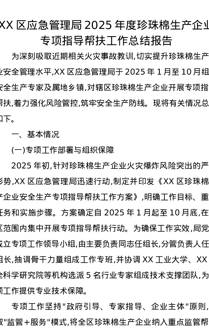 XX区应急管理局2025年度珍珠棉生产企业专项指导帮扶工作总结报告
