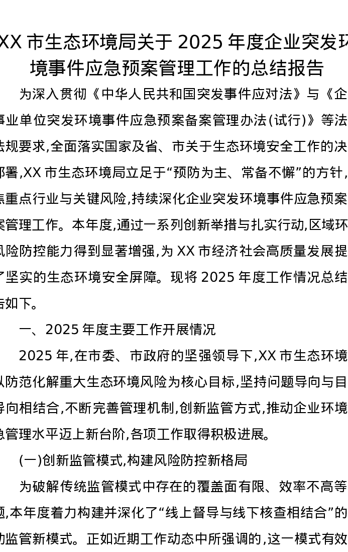 XX市生态环境局关于2025年度企业突发环境事件应急预案管理工作的总结报告
