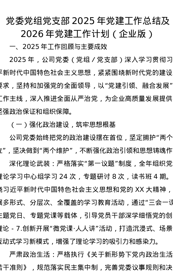 党委党组党支部2025年党建工作总结及2026年党建工作计划(企业版)