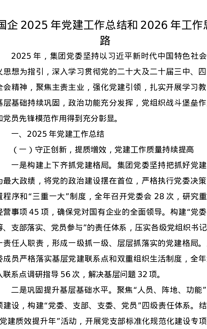 国企2025年党建工作总结和2026年工作思路