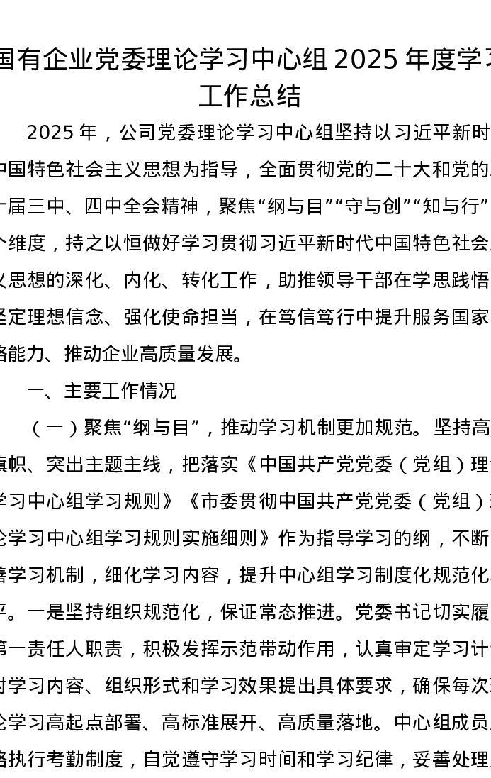 国有企业党委理论学习中心组2025年度学习工作总结
