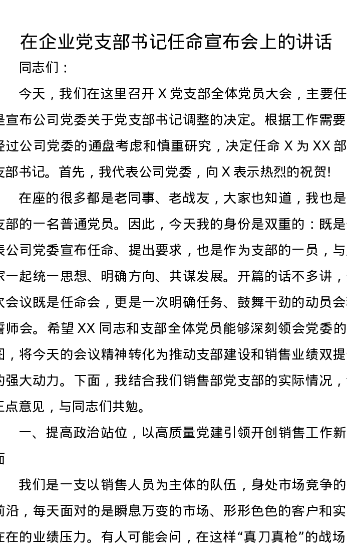 在企业党支部书记任命宣布会上的讲话