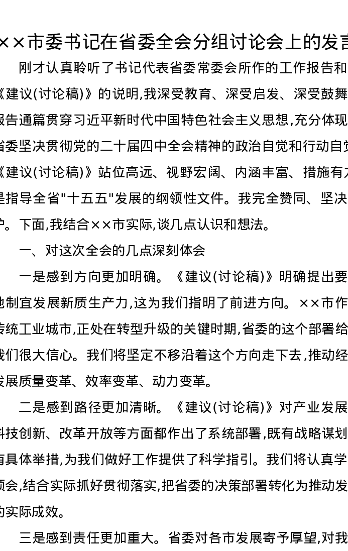 ××市委书记在省委二十届四中全会分组讨论会上的发言