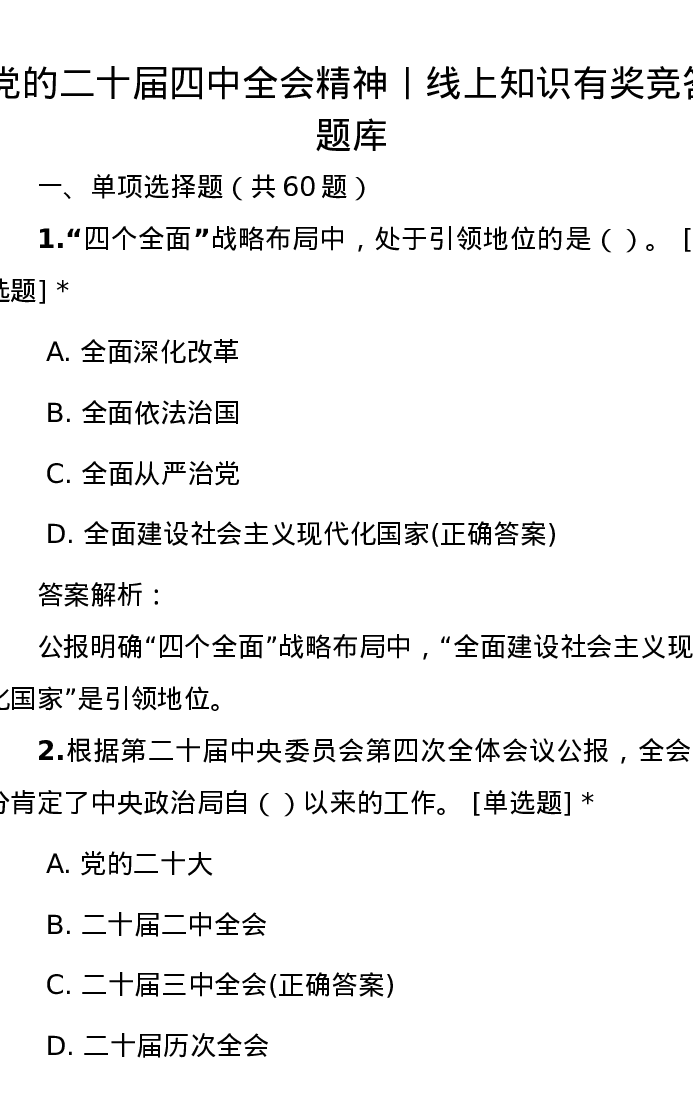 党的二十届四中全会精神丨线上知识有奖竞答题库